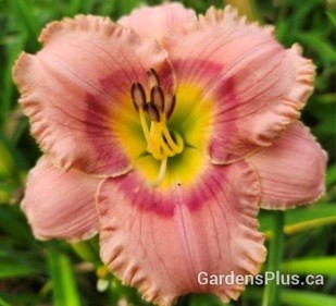 Amazing 4.5″, pink flowers with a triangular red eye and a green throat. Blossoms are round in form and heavily ruffled