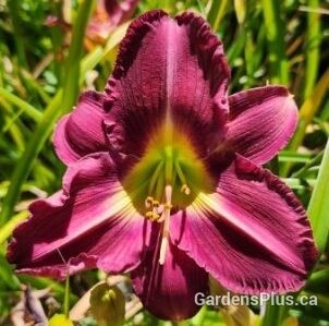 One of the best daylilies in its color class! Putting on a terrific show in the garden, this daylily produces loads of large 6″, shimmering diamond dusted, lavender mauve flowers with a prominent citron yellow throat and matching purple stamens. Ruffled, recurved tepals open wide and flat revealing the triangular flower form.